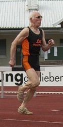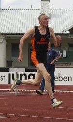 Heinz Stäcker (M75) , unser 78-jährige Dauerbrenner, lief die 100 m in 17.36 s und sprang 3,42 m weit. Hut ab vor diesen Leistungen, die bei anderen äußeren Bedingungen noch besser gewesen wären. Natürlich jeweils der 1. Platz.