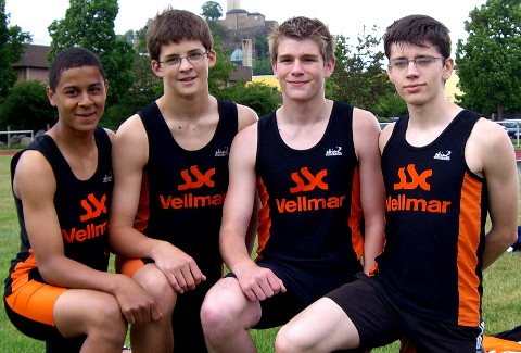 Noch war nicht klar, wie die 4 x 100 m Staffel der A-Schüler laufen sollte, wir wollten erst die M15-Läufe abwarten. Christoph Gebauer schaffte 12.6 s, verzichtete danach wegen einer Erkältung auf den Endlauf, bei Martin Heine blieben die Uhren bei 13.1 s, bei Alexander Klimsa bei 13.2 s, und bei Malte Klingenberger bei 13.6 s stehen. Der vakante Platz des Schlussläufers wäre an Fabian Tiedjens, wenn er nicht Beschwerden im Oberschenkel gehabt hätte, gegangen. Aber was soll es, wir hatten ja Martin Heine, der auch eingewechselt war. In der folgenden 4 x 100 m Staffel liefen die A-Schüler Christoph Gebauer, Joshua Redmond, Sven Eichel und Martin Heine ein prima Rennen, und schafften trotz Sicherheitswechseln die ausgezeichnete Zeit von 48.39 s, diesmal vollelektronisch gemessen. Damit verbesserten sie auch den Vereinsrekord der M15.