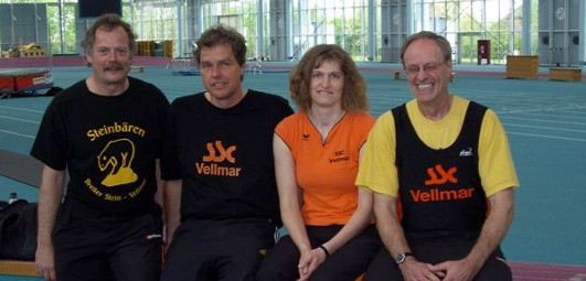 Schnell sich noch einiger Gramm Winterspecks entledigt um in attraktiveren Gewichtsklassen zu starteten fuhren Carmen Krug, Georg Weitzel, Dieter Uffelmann und Hartmut Nuschke nach Frankfurt-Kalbach in das dortige Bundesleistungszentrum. Carmen Krug war nun diesmal in der Klasse bis 73 kg und war noch leistungsstärker als bei den Hessischen Meisterschaften vor vier Wochen an gleicher Stelle. Sie erzielte mit dem 5 kg-Stein mit 10,04 m persönliche Bestleistung bei den Seniorinnen 2 und wurde erste deutsche Meisterin des SSC im Rasenkraftsport. Dem nicht nachstehen wollte Hartmut, erzielte zwar nicht ganz die gewünschte Weite aber wurde ebenfalls Deutscher Meister der Seniorenklasse 3 über 87 kg. Der 10 kg-Stein landete bei 9,83 m. Den zweiten Start absolvierte Carmen in der offenen Frauenklasse bis 78 kg. Hier hatte sie es mit erheblich jüngeren zu tun, überzeugte aber trotzdem mit 9,82 m und Platz drei. Georg Weitzel hatte in der Seniorenklasse 2 über 87 kg ein starkes Teilnehmerfeld und belegte mit 8,22 Platz fünf. Bei seinem zweiten Start in der offenen Männerklasse über 98 kg hatte er dann aber noch ausreichend Kraft und wurde mit 8,20 m Bronzemedaillengewinner. Dieter Uffelmann, unser ältester Teilnehmer, wurde in der Seniorenklasse 3 bis 87 kg Fünfter mit 7,69 m. Den gleichen Platz belegte er in der offenen Männerklasse bis 90 kg mit 5,77 m ebenso wie Hartmut in der offenen Männerklasse Klasse bis 98 kg mit 7,72 m.