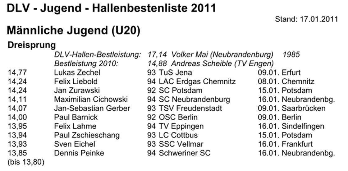 sen. 4,40m im Weitsprung brachten die Position 4 ein, 1,28m Platz 5, 7.78s über die 50m Platz 9 und Rang 10 im Vierkampf (1334). Auch für Philipp eine hervorragende Saison.