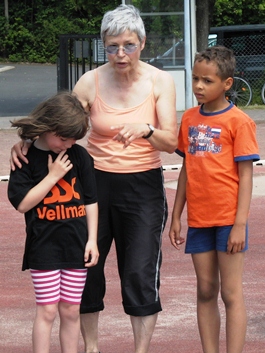 Karin Reitemeier ist auch eine 45-igerin. Erfreulich ihre Verbesserungen im Hochsprung auf 1,35m und im Kugelstoßen auf 8,10m. Im 100m Lauf wurden in guten 14.41s gestoppt.