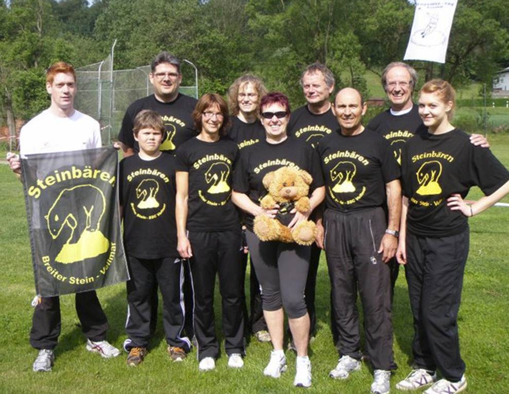 Die erfolgreichen Steinbären mit (v.l.n.r) Einzelkämpfer Christian Rapp, Lucas und Christian Gundlach, die Frauenmannschaft mit Karin Reitemeier, Carmen Krug, Hannelore Herrmann und Maskottchen Happy, die Männermannschaft mit Hartmut Nuschke, Basilius Balschalarski und Dieter Uffelmann sich festhaltend an Theresa Klimpel in den neuen Steinbärentrikots.