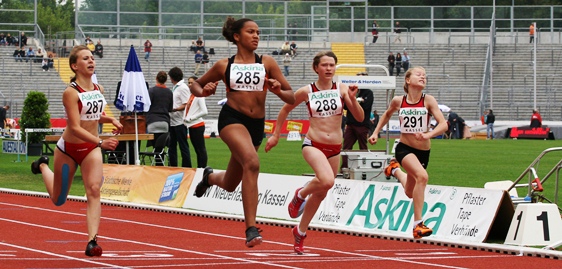 Sharin Oziegbe (W13) war eine der Favoritinnen von 50 Mädchen. Es wurde nur der Block Lauf angeboten. Gleich zu Beginn musste sie den 60m-Hürdenlauf bestreiten. Erst kürzlich konnte sich in dieser Disziplin den Nordhessenrekord auf tolle 9.55s verbessern. Als nach einem fulminanten Rennen die Anzeigetafel 9.42s zeigte, konnten wir es kaum glauben. Eine erneute Verbesserung des Nordhessenrekordes. Bisher sind nur sehr wenige Gleichaltrige in Deutschland diese Zeit gelaufen, in diesem Jahr wahrscheinlich noch kein Mädel. Mit dem Ballwurf war Sharin ebenfalls zufrieden, denn 41m hatte sie noch nie geworfen. Dann die 75m. Sie stellte mit 10.00 ihre Bestleistung ein. Im Weitsprung ging es dann wie selbstverständlich bei jedem Sprung über die 5m, die erreichten 5,27m waren nicht das Optimum. Trotzdem ein Superergebnis. Während des Weitsprungs bekam Sharin starke Magenbeschwerden und ihr war übel. Die Teilnahme beim abschließenden 800m Lauf stand auf der Kippe. Dann konnte sie doch noch, wenn auch gehandicapt, starten. Mit einer Energieleistung schaffte sie bis zum Umfallen 2:51.21min bei unheimlich heißer Temperatur. Um 3 Punkte hat sie den Hessentitel verfehlt, dennoch den hervorragenden Nordhessenrekord mit 2641 Punkten eingestellt. Total geschafft brauchte sie lange Zeit bis zur Regeneration.