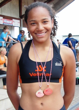 Sharin Oziegbe (W14) kam drei Tage vor der Meisterschaft von einer Syltfreizeit der Schule zurück. Dort herrschte schlechtes Wetter, und täglich wurde mehrere Stunden gewandert und umso kürzer geschlafen... Klar, dass das nicht die besten Voraussetzungen für Gelnhausen waren. Sharin ist noch B-Schülerin W13, und starte hoch zur Klasse W14. Beim Weitsprung gab es einen spannenden Kampf um die Medaillen. Mit 5,32m gewann Sharin Bronze, Silber ging mit gleicher Weite fort. Die Siegerin war 4 cm besser. Ein schöner Erfolg gegen die älteren Gegnerinnen. Den Höhepunkt brachte dann der 80m Hürdensprint. Den Vorlauf gewann Sharin in hervorragenden 12.42s, und verbesserte damit bereits den W13 Nordhessenrekord von Petra Machmar aus dem Jahr 1975!! um 2/100s. Dann der Endlauf und eine abermalige Verbesserung auf "sensationelle" 12.19s. Die beste deutsche W14erin des Vorjahres lief 11.95 s, und Sharin ist erst W13. In dem enorm schnellen Rennen wurde Sharin hervorragende Zweite. Die Siegerin war schneller als die beste Deutsche des Vorjahres, und setzte sich mit tollen 11.87s an die diesjährige deutsche Spitze. Zum Nordhessenrekord der W14 fehlen Sharin nur noch 15/100s, den hält Pamela Dutkiewicz mit 12.03s. Sharin versetzt uns von Mal zu Mal ins Staunen.