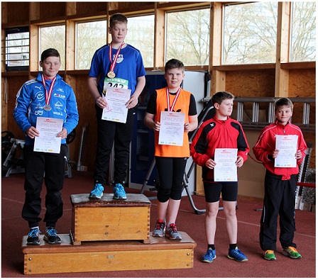 Luca Hertel wurde im 60m Sprint in 7.8s und im Weitsprung mit 5.39m jeweils Vizemeister, Rang drei dann beim Hochsprung (1,57m). Die Kugel flog 8,07m weit (8.). Wenn Luca weiter gut trainiert, wird er sich weiterhin verbessern und sich im Weitsprung den 6m nähern