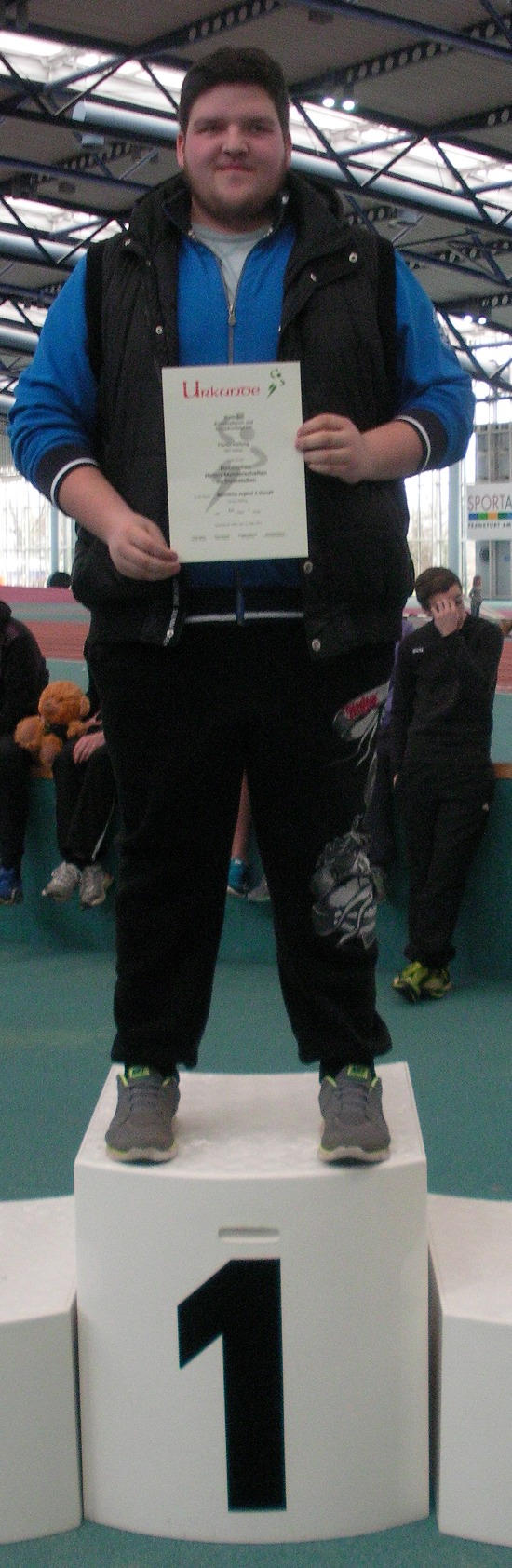 Gero Grenzemann hatte beim Kugelstoßen und dem Hochsprung seine stärksten Disziplinen. 7.75m brachten die Vizemeisterschaft, seine tolle VErbesserung auf 1,39m im Hochsprung Rang 4. Als Fünfter sprang Gero 4,15m weit und durchlief die 60m als Achter in 9.4s.