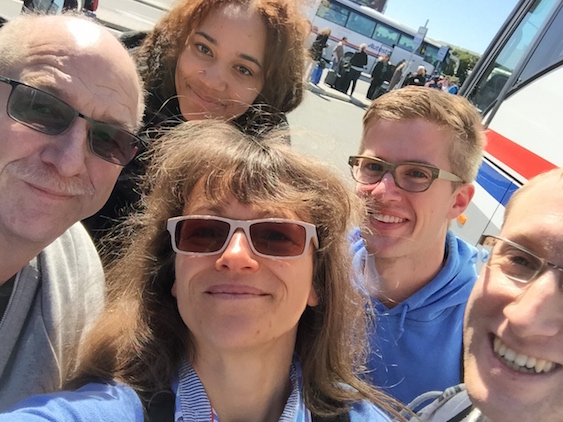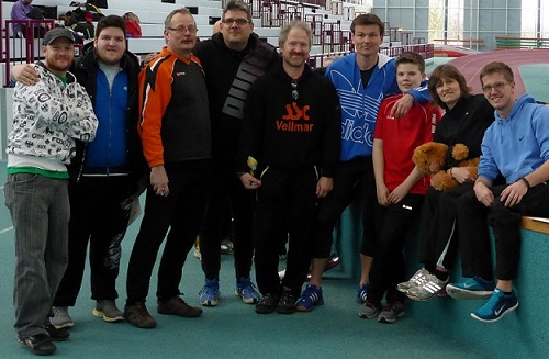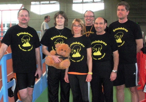 Die Aktiven in einer Wettkamfpause (von links nach rechts): Hartmut, Carmen mit Maskottchen Happy, Karin, Dieter, Basilius und Georg.