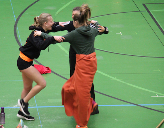 Pia übergab als Startläuferin an Carlotta. Bei diesem Wechsel ging irgendetwas daneben, wie es bei Stabwechseln oft vorkommt. Der Staffelstab fiel zu Boden und das Rennen schien schon verloren. Doch Carlotta und Merle kämpften um den Anschluss. Janina als Schlussläuferin lief ein fantastisches Rennen, und fing die führende Mannschaft einen Meter vor der Ziellienie ab. Freude pur bei unseren Mädchen, und Janina wurde fast erdrückt.